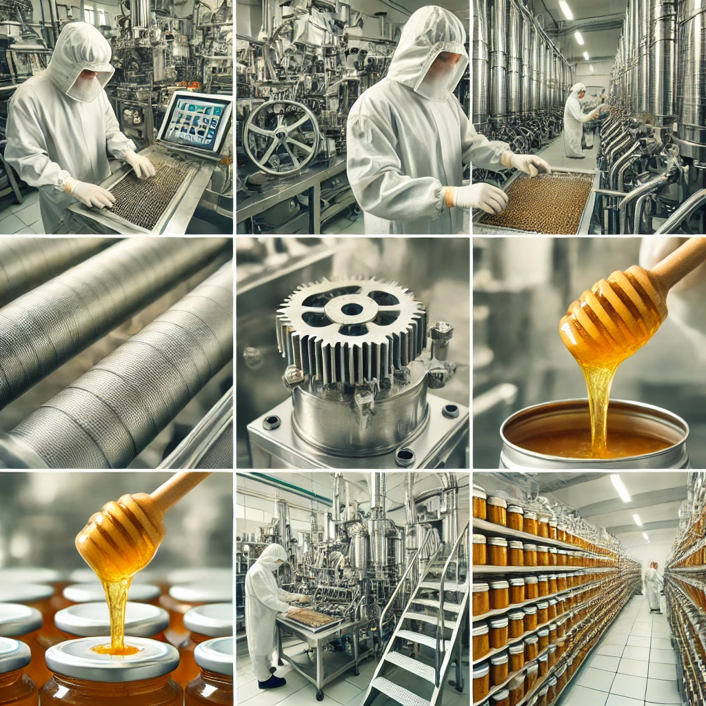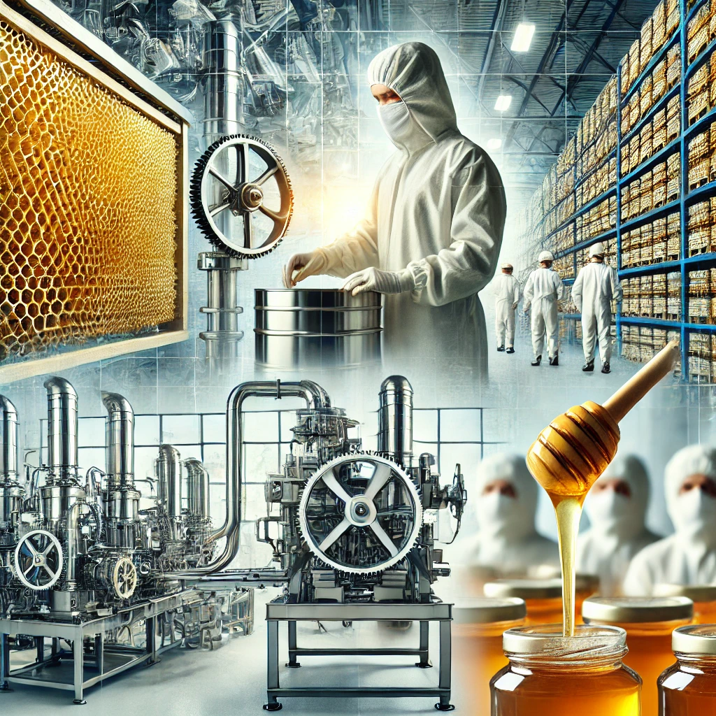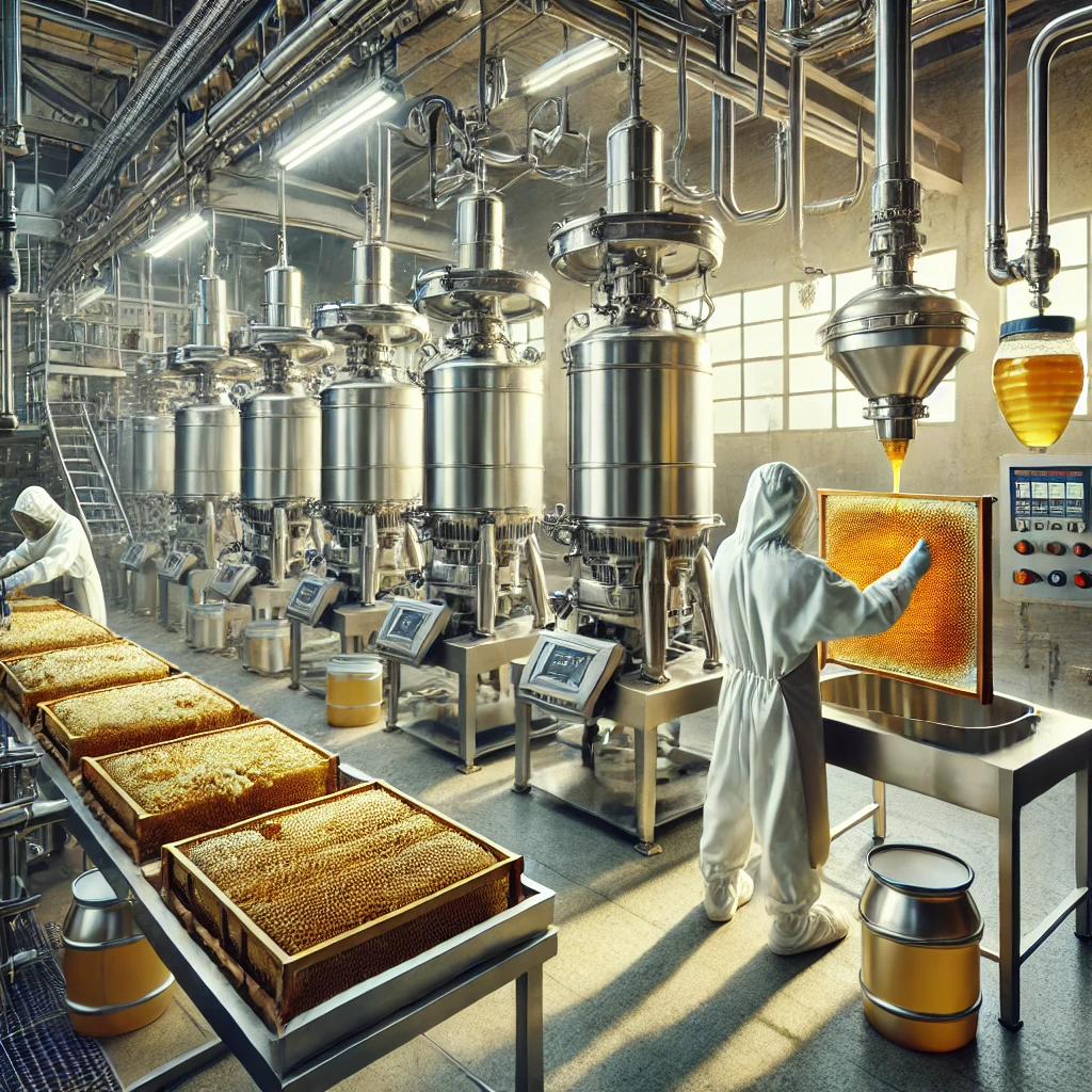 DALL·E 2024-07-04 01.00.44 - An authentic picture of honey manufacturing. Show a modern facility with workers in protective gear, using advanced machinery for extracting and bottl